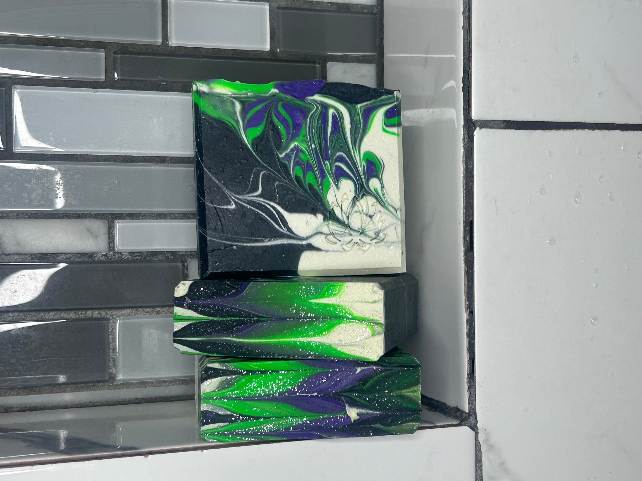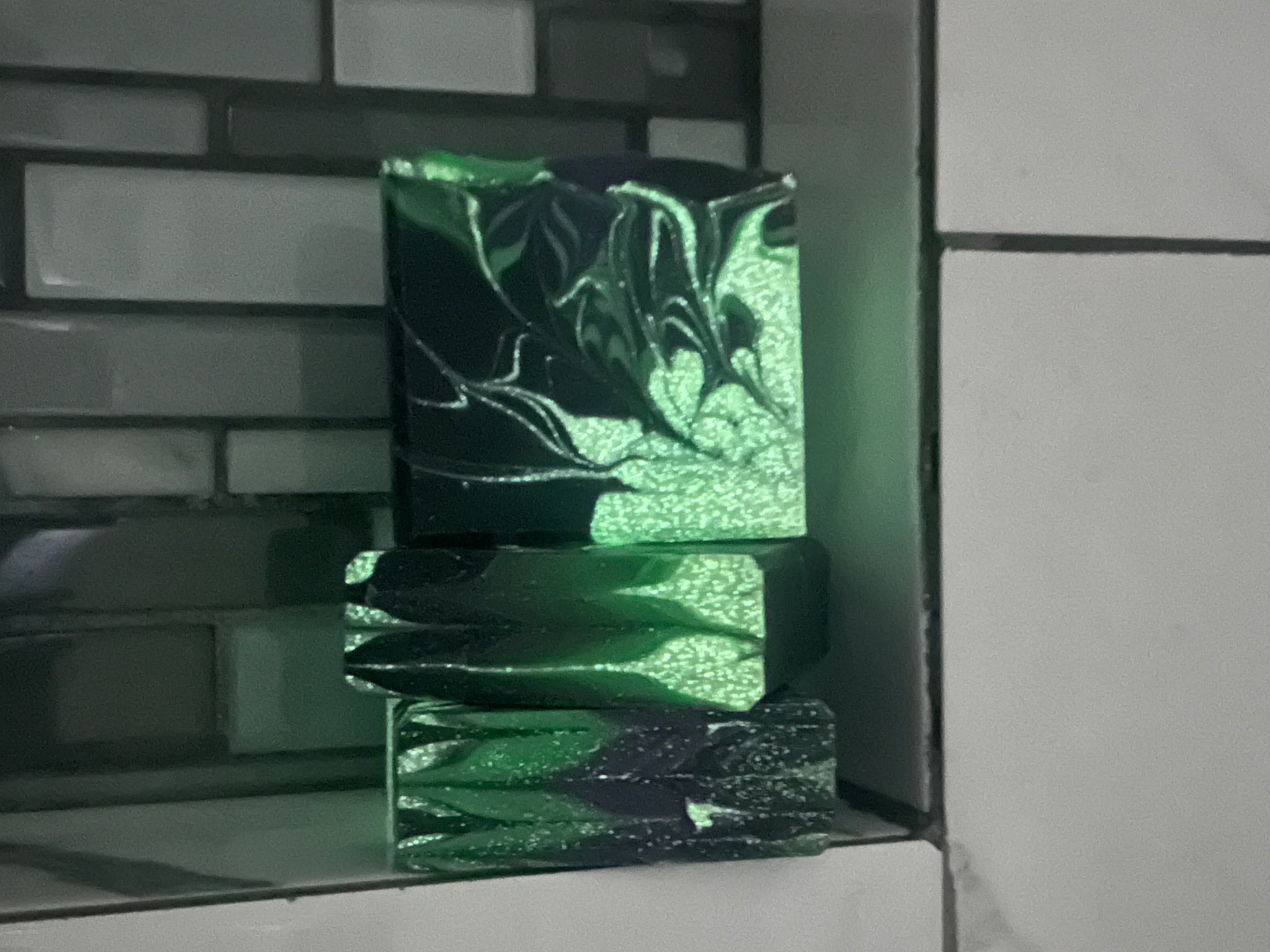 Sandworm Artisan Soap is made with Saponified African shea butter, olive oil, coconut oil, castor oil, sugar, kaolin clay, activated charcoal, titanium dioxide, mica, glow in the dark pigment, eco-glitter and scented in Nurture Soap All Souls Day fragrance oil.